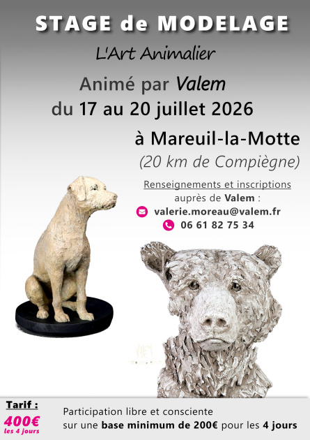 Le stage Art Animalier d’avril ayant très vite affiché complet, je propose une seconde session : Du 17 au 20 juillet 2026 à Mareuil-la-Motte Télécharger le descriptif détaillé du stage Télécharger la fiche d'inscription |